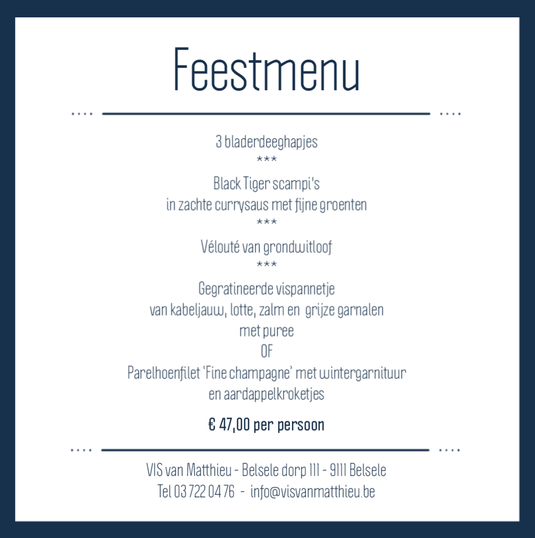 | Duo van schartong en zalm, grijze garnalen, prei, champignons, kreeftensaus en puree | € 28,00 |